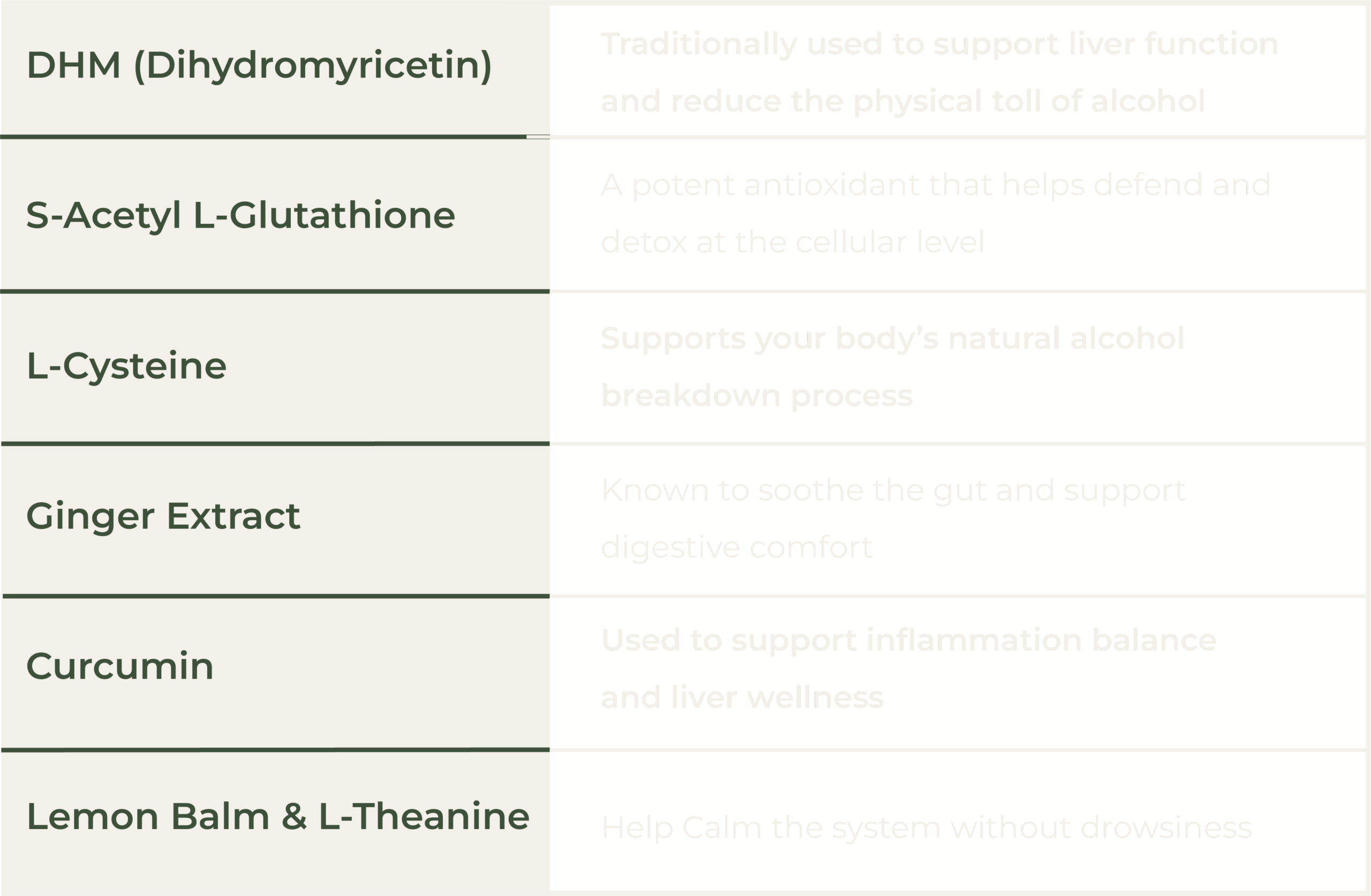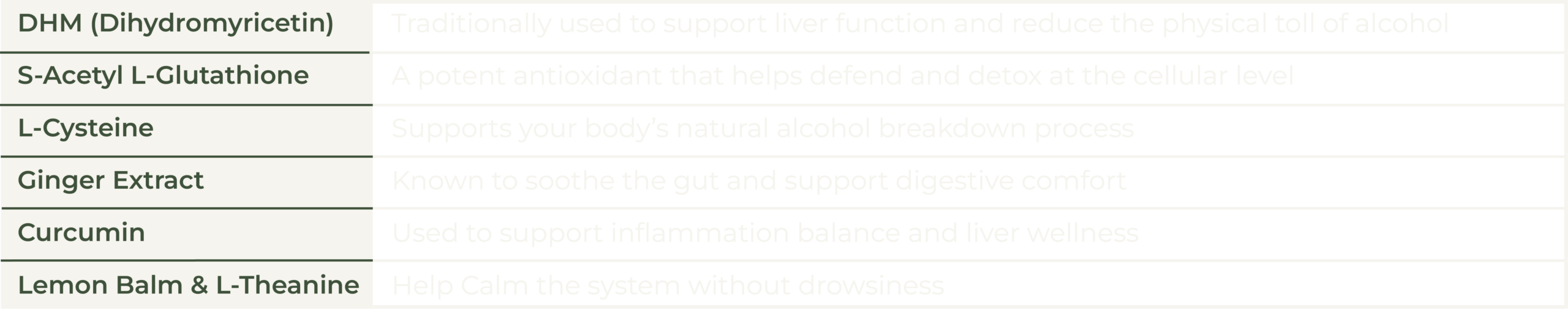 Each serving is packed with fast-acting ingredients that support liver function, digestion, and recovery so you can enjoy the night and reclaim your morning.