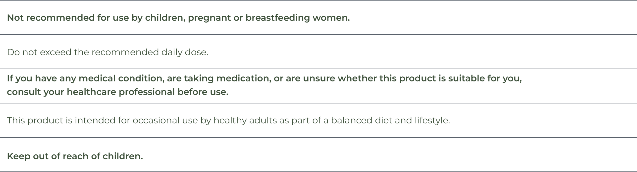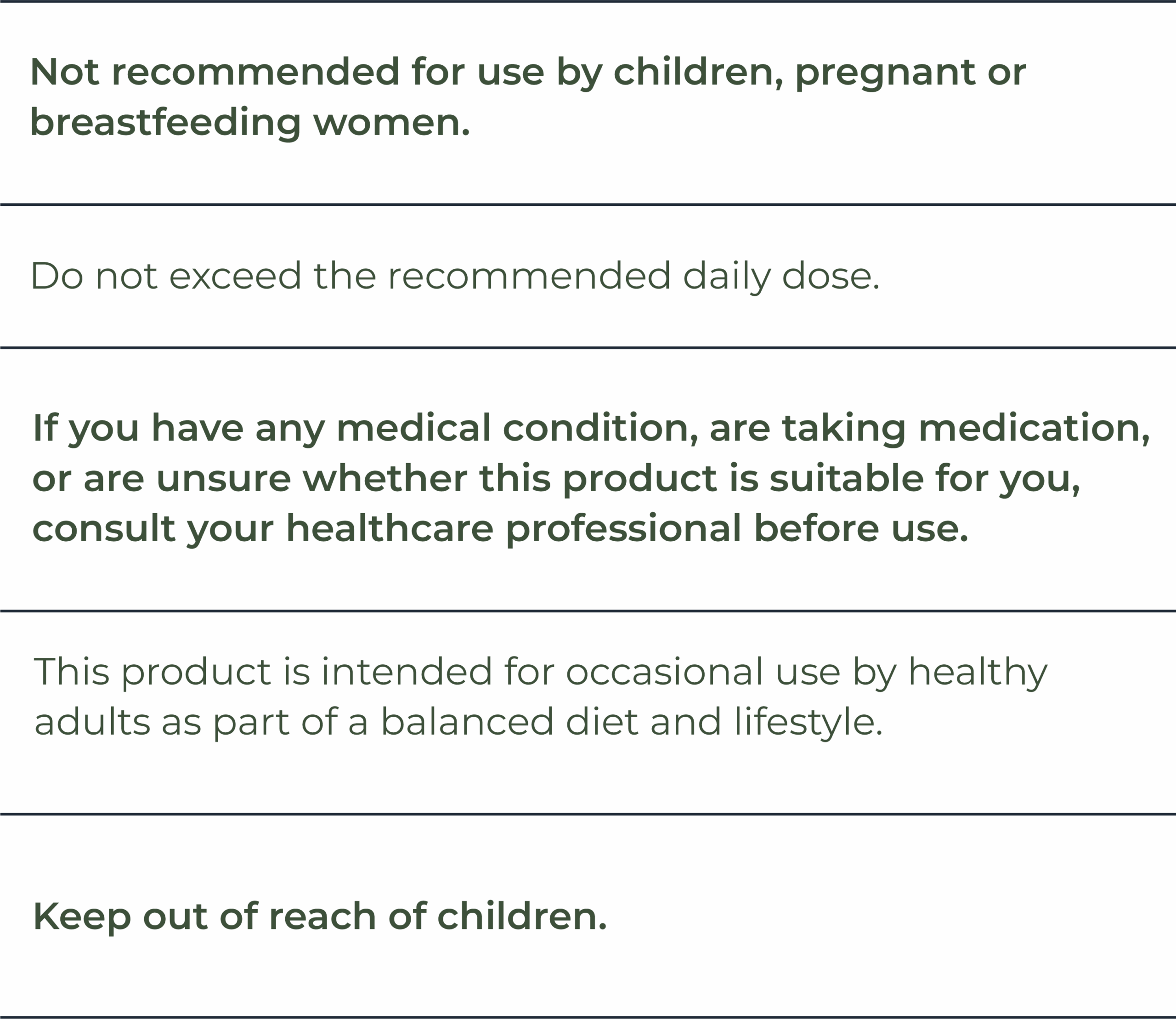 This product is a food supplement. It is not intended to diagnose, treat, cure, or prevent any disease or medical condition. Always read the label and use only as directed. If symptoms persist, consult a healthcare professional.